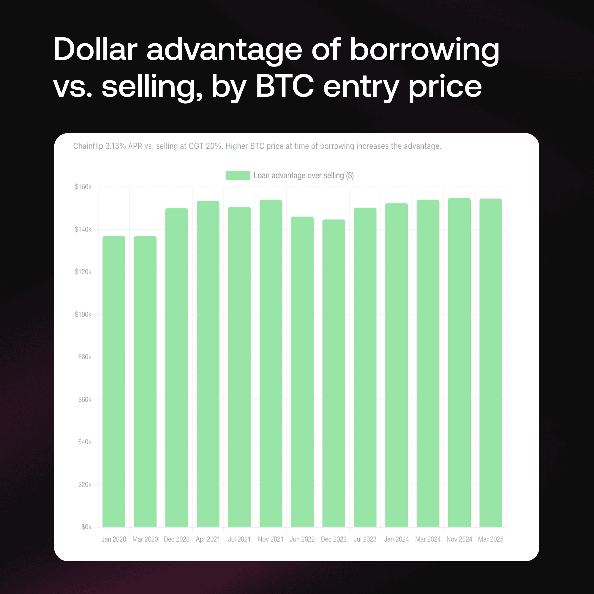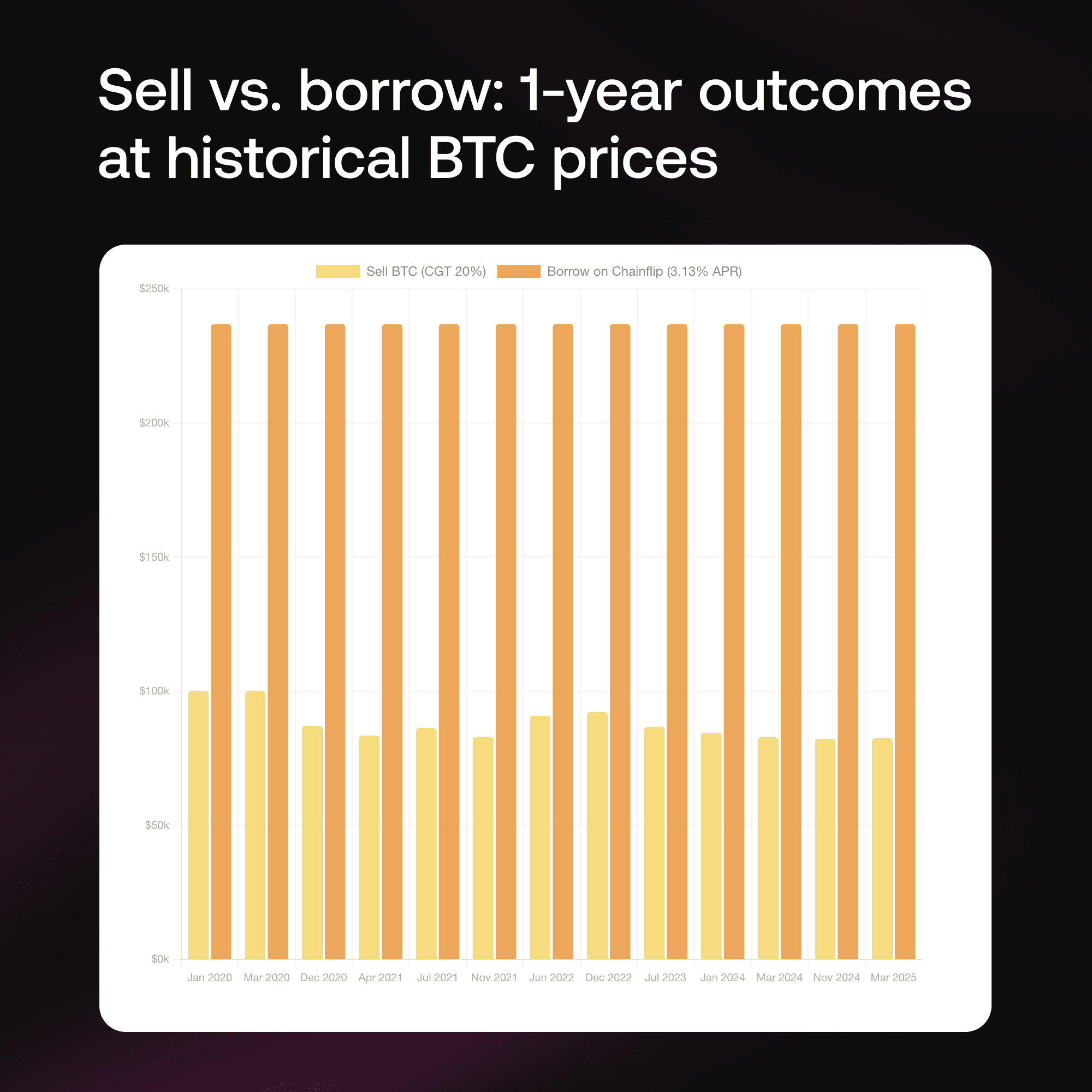 At 45% CGT, selling enough BTC to raise $100,000 costs $42,147 in tax alone. The Chainflip loan costs $3,130 in interest. That is a 13x difference in the cost of accessing the same liquidity, before accounting for the BTC upside forfeited by selling.