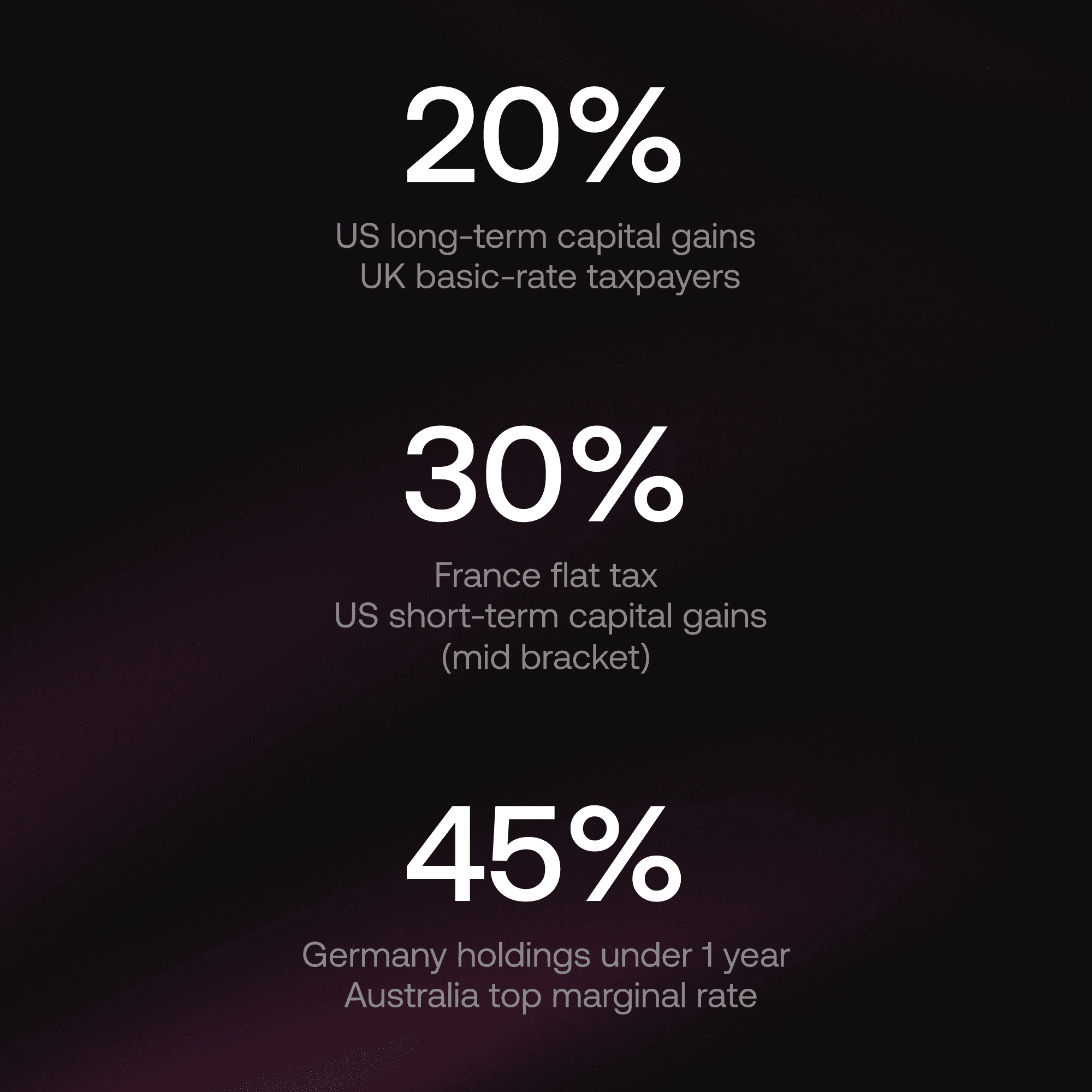 Rates vary significantly by country. US long-term holders pay 20%. French residents face a 30% flat rate. In Germany and Australia, top-rate taxpayers can face up to 45%.