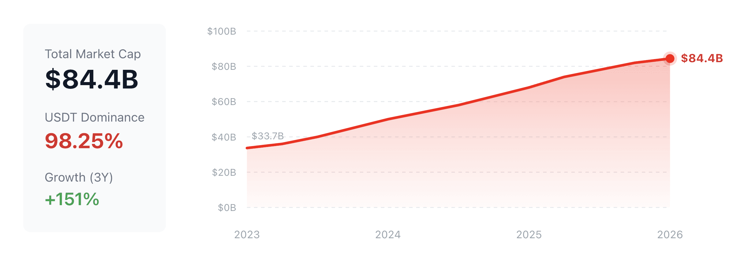 Tron's stablecoin market cap has grown from $33.7 billion in January 2023 to over $84.4 billion in January 2026, a 151% increase in three years. USDT accounts for 98.25% of all stablecoins on the network. This growth reflects Tron's position as a dominant infrastructure for stablecoin settlement globally.