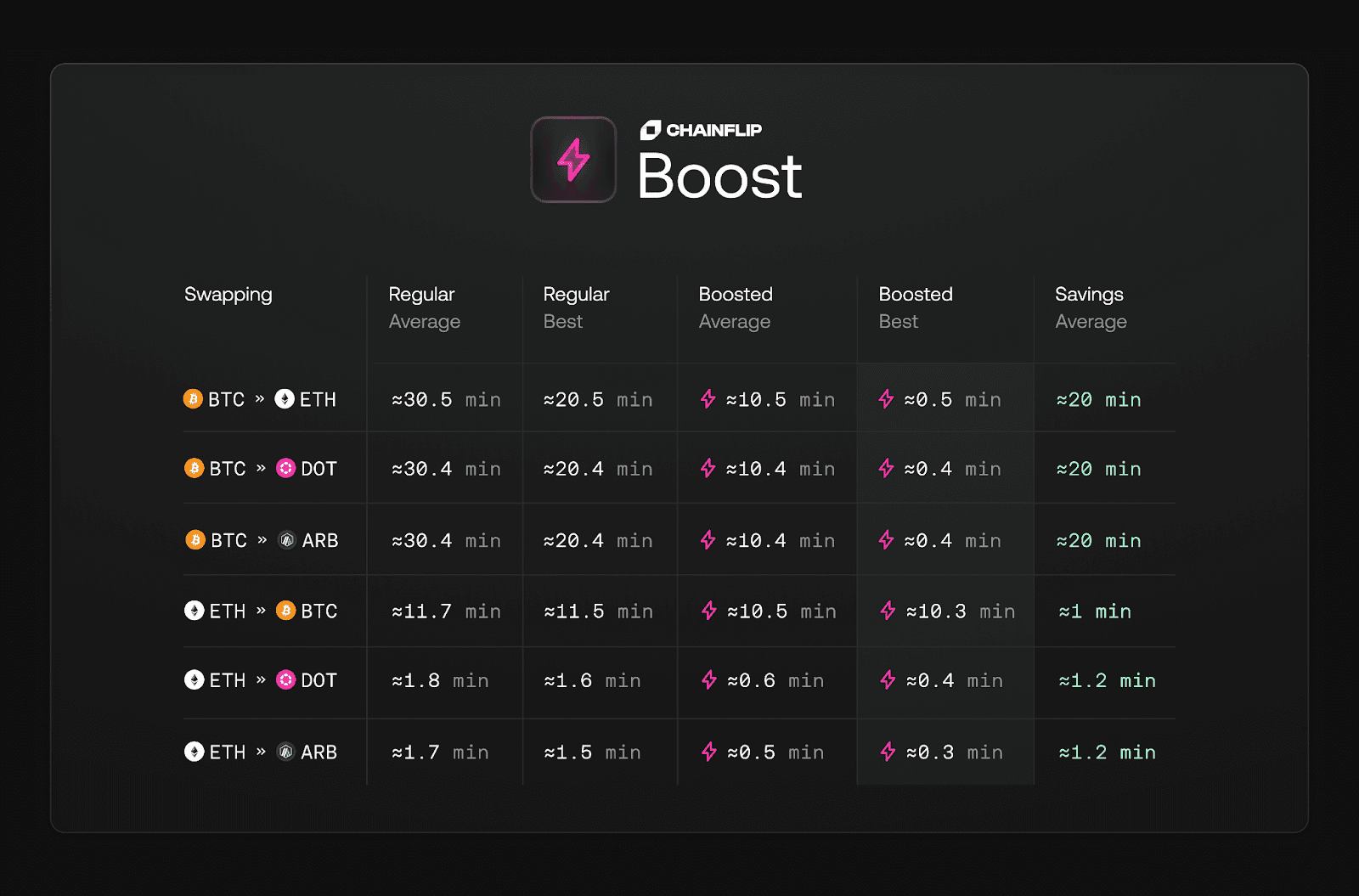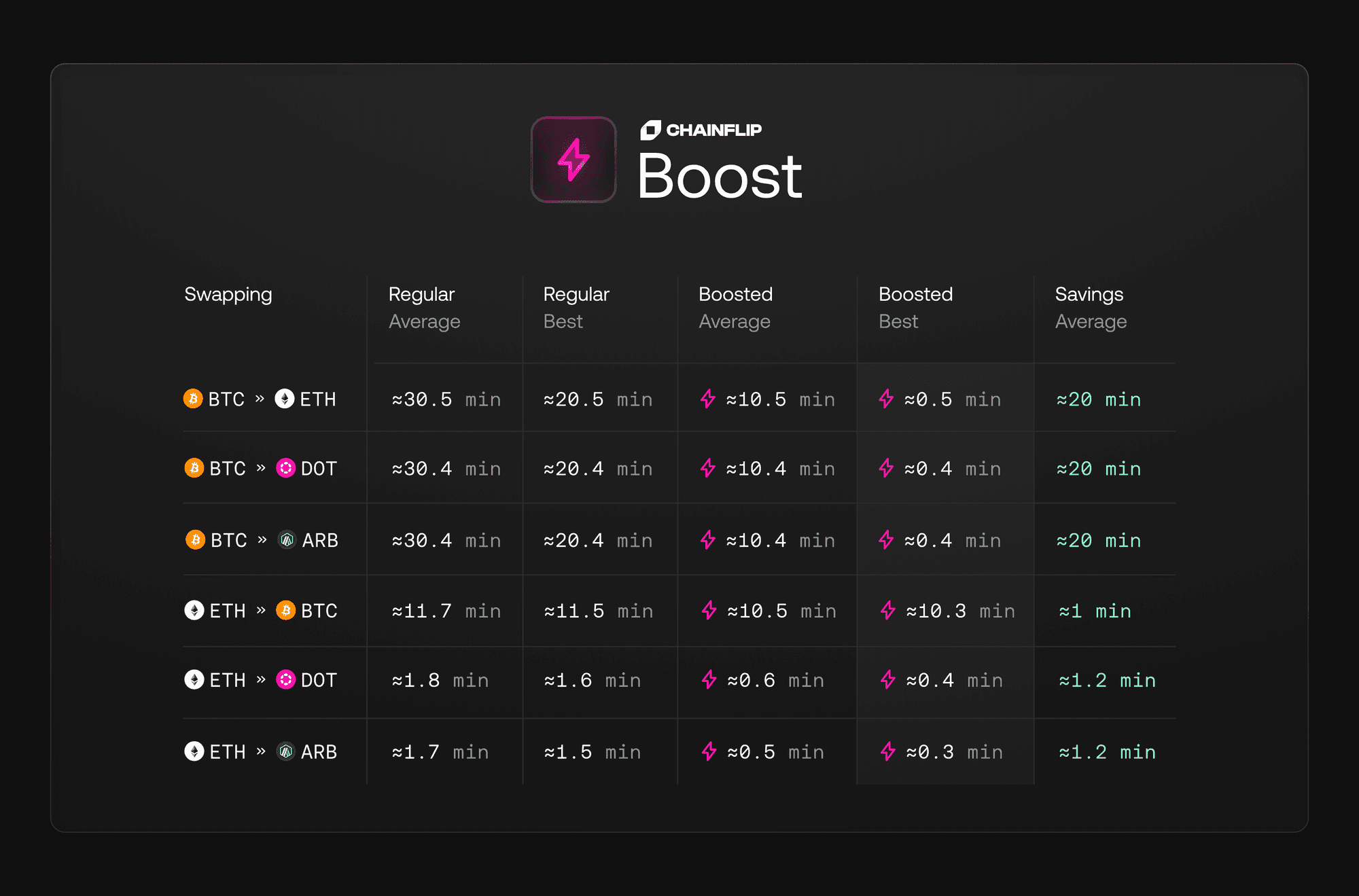 The basic version of Boost will be going into 1.4. Initially, it will be turned off and then gradually rolled out, firstly to Bitcoin, and then to the other chains. We estimate that BOOST will be made available to users on the Chainflip frontend (which requires extensive overhauls to keep the swapping experience smooth) in June, and our integration partners shortly afterwards.
