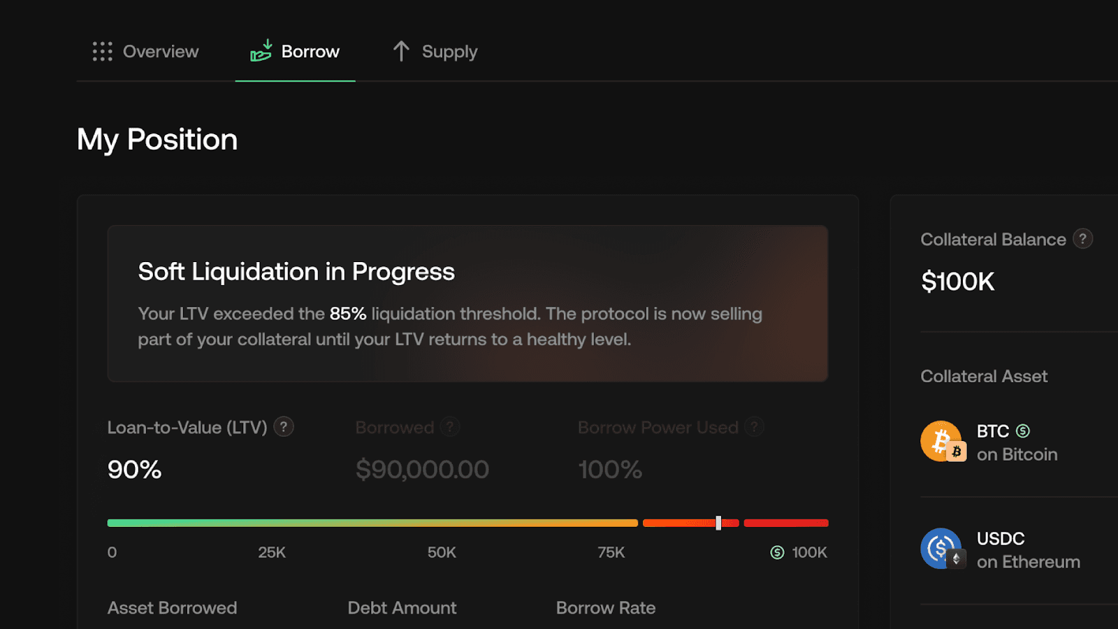 Our soft liquidation mechanism starts unwinding loans when collateralisation falls below threshold, using near-market rates rather than panic pricing. If volatility pushes collateralisation to critical levels, a more aggressive strategy takes over.