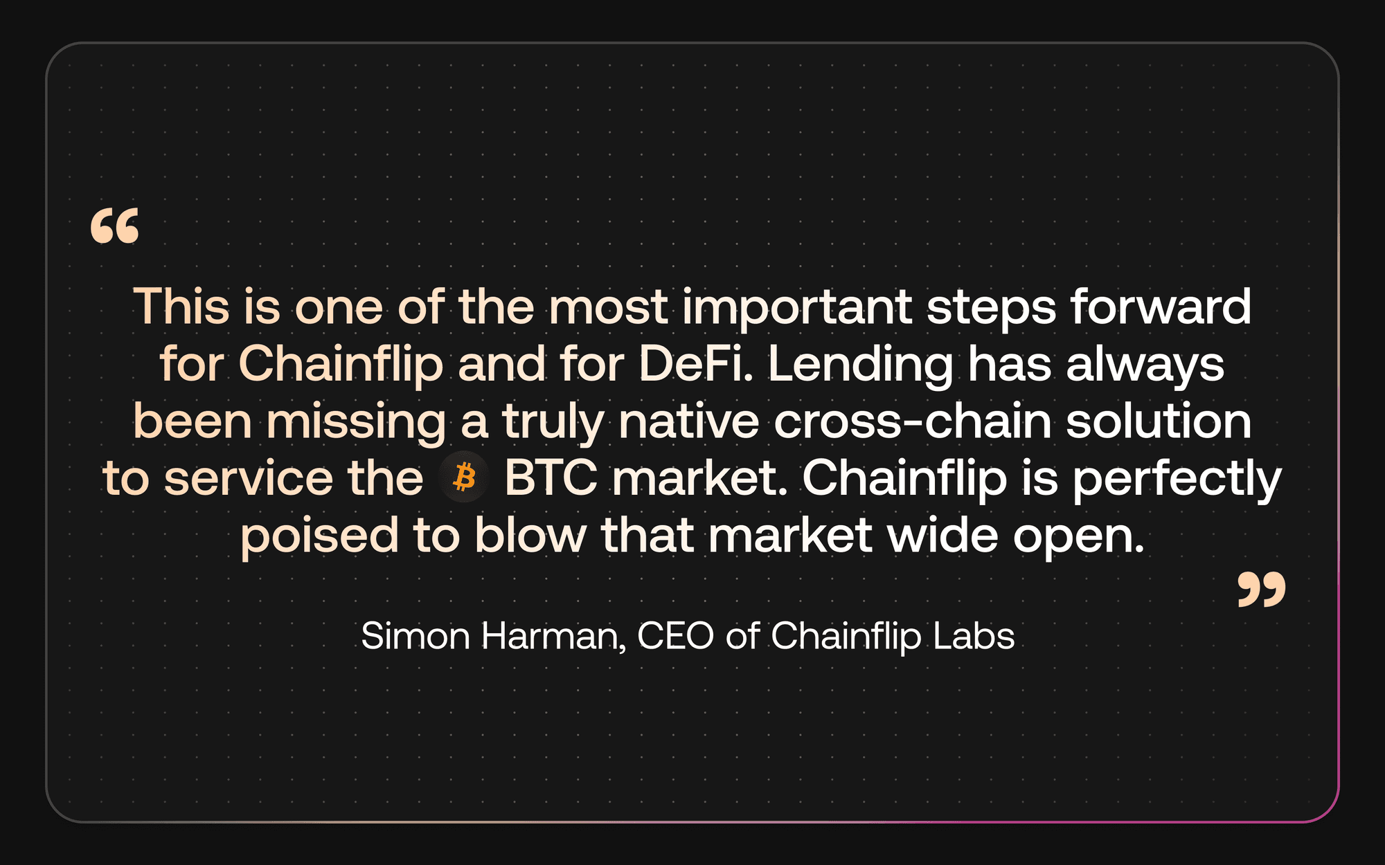 Chainflip Lending is the first permissionless, cross-chain lending market for native Bitcoin. It allows users to lend and borrow BTC, ETH, SOL, USDC, USDT, and other supported assets directly across chains without using wrapped tokens, bridges, or centralised intermediaries.