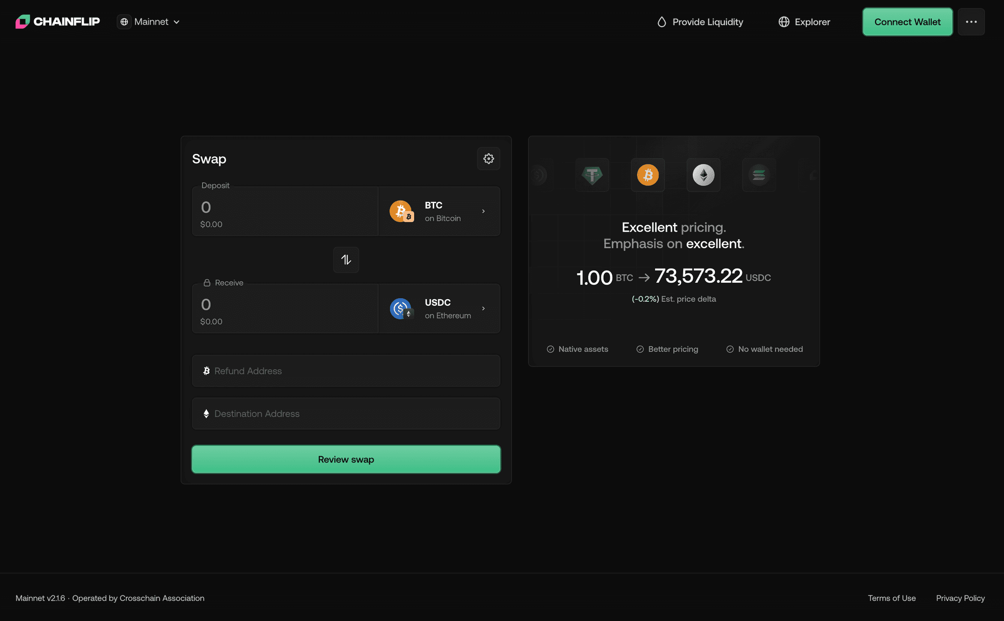 The best way to understand cross-chain swaps is to experience one. On Chainflip, you can swap without connecting a wallet. Simply provide destination addresses, send your deposit, and watch the mechanics unfold.