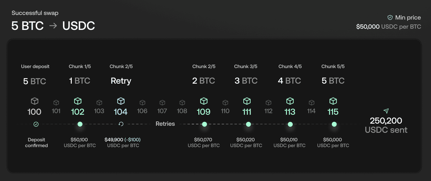 4. Handling a Below-Minimum Price: At block 104, the second swap receives a price of 49,900 USDC, which is below the minimum set by the user. Instead of executing at a suboptimal price, the swap is rescheduled to allow for a price recovery. It will be retried based on the swap deadline before initiating a refund.