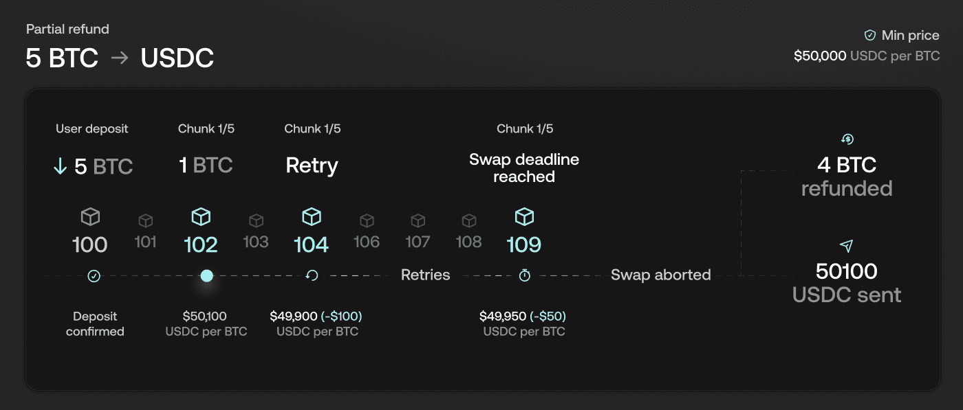 5. Partial Refund Completion: The user receives 50,100 USDC from the successfully executed first chunk, while the unexecuted amount (4 BTC) is returned to the original BTC wallet address.