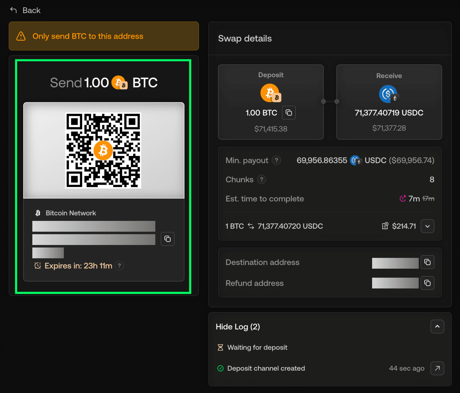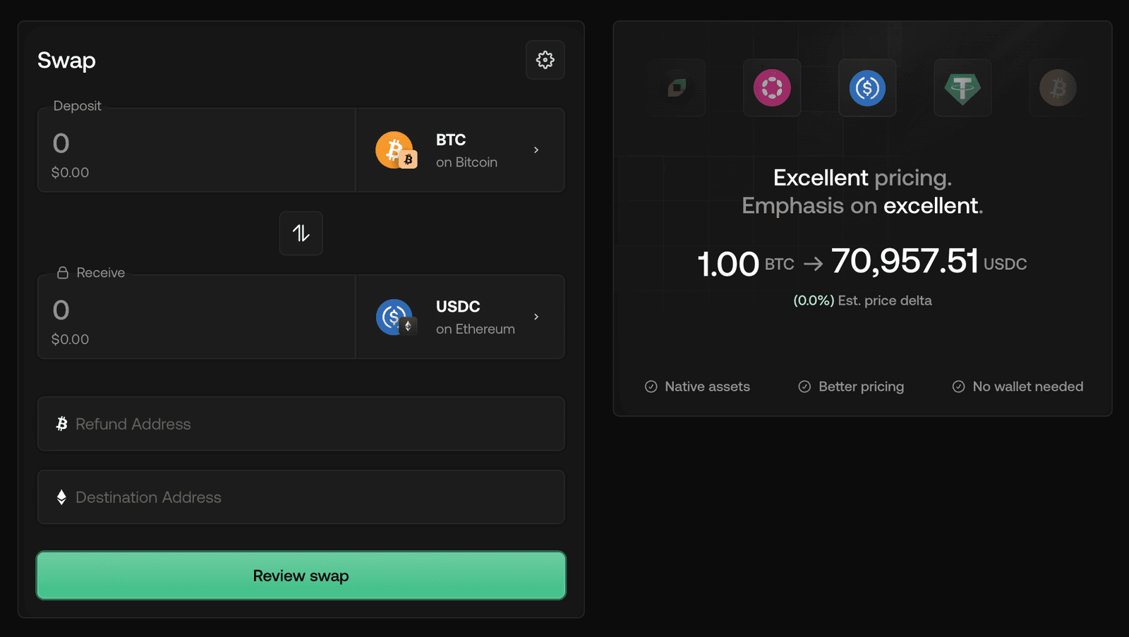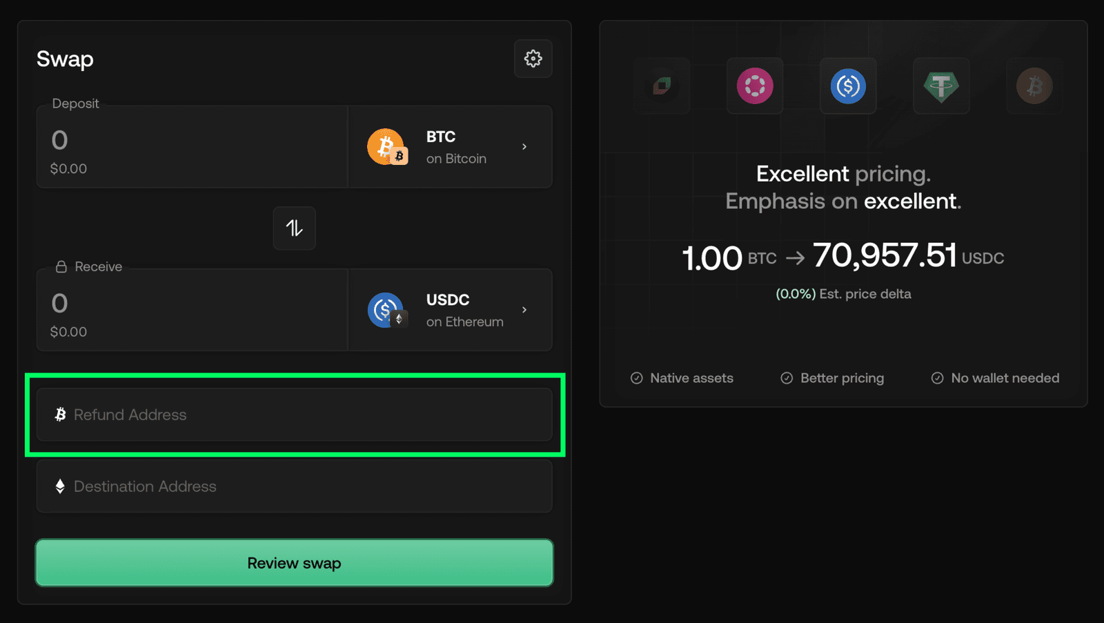 Send your funds to the deposit address the protocol generates. Here you can easily initiate a swap from any wallet, hardware wallets, multisigs, exchange withdrawals, without connecting it to the interface.