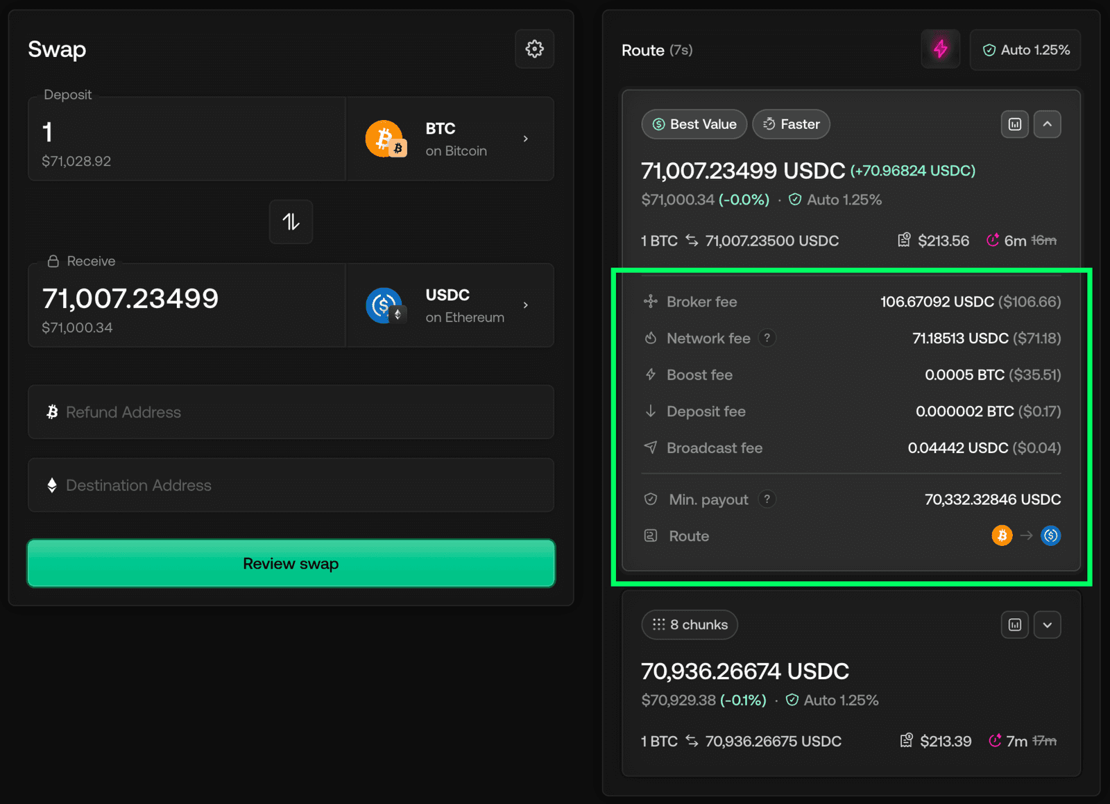 Chainflip charges a protocol fee on each swap, plus network fees for the chains involved. The interface shows you the estimated output before you send, so you can see exactly what you'll receive.