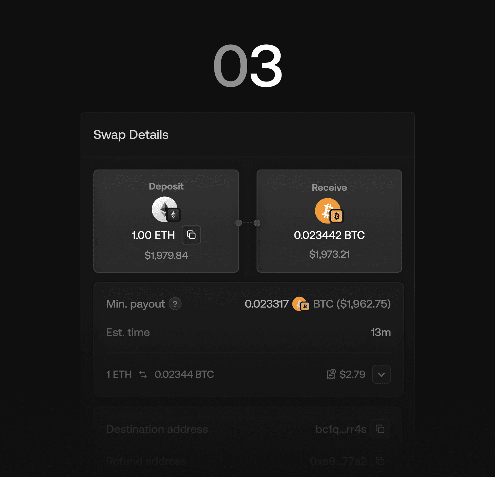 Chainflip takes care of the rest, executing the swap natively and delivering your BTC directly to your recipient wallet address.