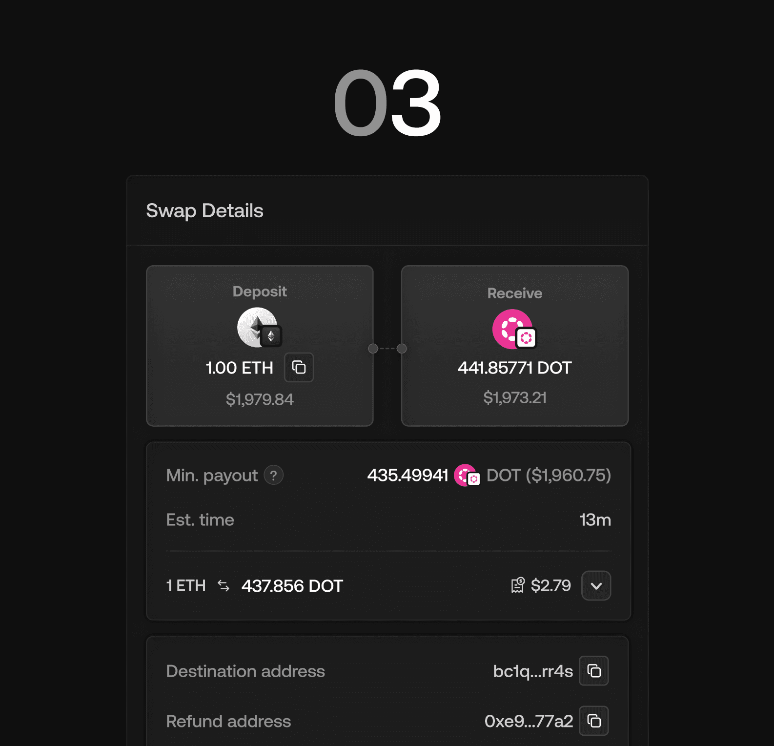 Chainflip takes care of the rest, executing the swap natively and delivering Polkadot directly to your recipient wallet address.