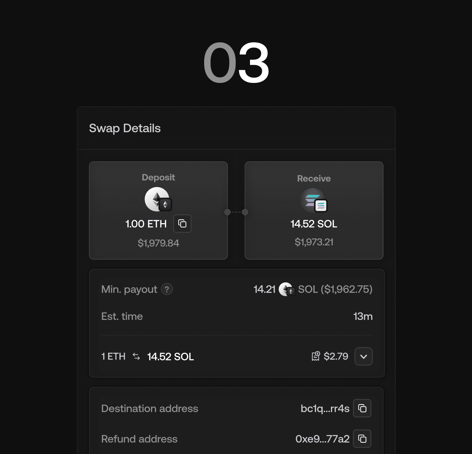 Chainflip takes care of the rest, executing the swap natively and delivering the chosen asset directly to your recipient wallet address.