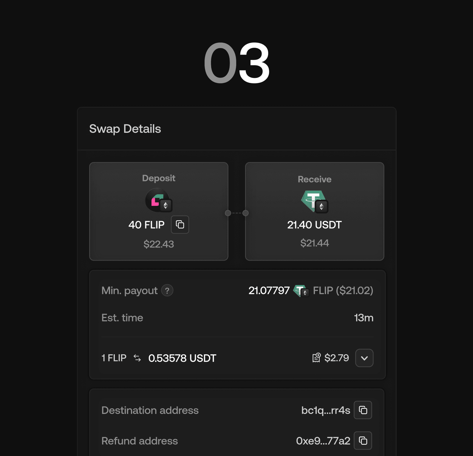 Select FLIP to USDT (or any other supported assets). Make sure you provide a destination address