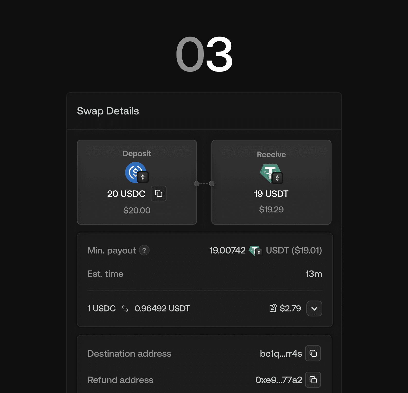 Select USDC to USDT (or any other supported assets). Make sure you provide a destination address